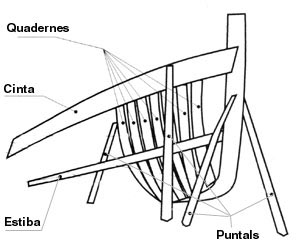 Quan ja es disposava de taulons adequats es procedia a extreure les plantilles o patrons de l'esbós que el mestre d'aixa havia elaborat prèviament de tota l'estructura interna. Amb els patrons, s'anava a provar entre els taulons de què es disposava, per veure quin era el més encertat; i quan es trobava, aleshores, es marcava la plantilla damunt del tauló, anomenat també taula. D'allí sortiria, per exemple, una quaderna una vegada portada la taula a la serra. A mesura que les peces s'anaven elaborant, s'estenien a l'indret on es construiria la barca. El següent pas significava plantar la quilla i les quadernes ja tallades. Si pensem en un símil entenedor, la quilla és la columna vertebral i les quadernes les costelles. Per aconseguir lligar aquestes costelles i que no s'obrissin, el mestre d'aixa marcava a l'esbós les anomenades estibes, fustes que anaven de proa a popa parel·leles a la quilla. Aquestes estibes, que estaven totes a la mateixa alçada gràcies a l'ús d'una plomada, servien com a lloc de recolzament dels puntals que mantenien dreta l'estructura inicial de l'embarcació. Quan la barca es trobava amb totes les quadernes clavades i a punt per posar el "forro", es deia que la barca estava "enramada". Ens va comentar un entrevistat que, aleshores, al taller del Vives, s'acostumava a fer un dinar amb els treballadors per celebrar-ho. L'acció de posar les taules per folrar tot l'exterior de la barca, s'anomenava "entaular" i era una de les tasques més lentes del procés de construcció. Primer s'havia de marcar la posició exacta de cada quaderna en un llistonet anomenat "jonquillo" marcat, es desclavava de damunt les quadernes i es posava damunt d'un tauló on s'hi traslladava la posició de cada una de les quadernes per poder després clavar-lo. Un dels problemes principals de la construcció d'una embarcació és la seva forma exterior, força allunyada dels angles rectes. Moltes de les taules que anaven al "forro" s'havien de presentar tortes a l'hora de fixar-les a les quadernes. Per aconseguir-ho, se li havia de donar foc per mitjà del torrador tal i com vam recollir: "el torrador era en terra, un bon foc. Tenies un bidó d'aigua amb una esponja o un tros de sac i li donaves aigua a la fusta. Amb la calentor i la humitat que agafava la taula s'anava dominant. Posant-hi un contrapès a la part del darrere es dominava". Un pare calafat i mestre d'aixa li deia al seu fill "acotxa't xiquet, que no se't cremi la taula!".
