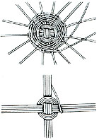 Com en altres treballs artesans, és difícil transmetre tot el procediment de la manufactura. En aquest cas, a més a més, la informació no l'obtenim del propi artesà sinó dels seus familiars. Fem referència al procediment d'una sola peça, representativa del treball de l'Arturo Berengué. Tant en els cistells com en els coves i paneres, el primer que es fan són els culs o la part central. L'Arturo acumulava aquests elements i en una altra ocasió confeccionava la resta. Segons el tamany de la peça es comença amb un número determinat de vímets que es disposen en dos grups. Per a una panera mitjana, per exemple, es necessiten 8 tires de vímet, que es col·loquen en creu (quatre i quatre). Quatre d'elles es foraden i les altres es tallen amb punxa, de manera que les segones puguin introduir-se en les primeres (per aixó cal que el vímet sigui molt moll). La creu se subjecta amb una altra tira de vímet i queden setze puntes per treballar-les. Si el cove, cistell o panera eren de grans dimensions, el cisteller emprava un piló per repenjar el genoll durant el teixit del vímet. Quan s'havien de passar vàries tires de vímet per un mateix forat de l'entremat, el cisteller utilitzava el passador, estri que podem veure en la fotografia. Les tisores de podar són un estri fonamental en les tasques de cistelleria. A la fotografia també veiem un ganivet corbat i un falçó. |