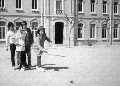 córrer amunt i avall. Aquesta modalitat rep el nom de via. La baldufa ha arribat a ser prohibida a les escoles, perquè algun xiquet ha pres mal amb ella, per jugar-hi en llocs prohibits o per haver trencat algun que altre vidre. Però no per això s'ha deixat de jugar-hi. Amb molta pràctica es perfecciona el llançament i s'arriba a ser un bon llançador. Tant la baldufa com altres jocs han estat i seguiran sent d'aquells jocs que no es deixaran de jugar mai, perquè s'han convertit en tradicionals, tot pasant de generació en generació. Nens jugant al pati del col·legi Vidal i Barraquer (Foto cedida) |