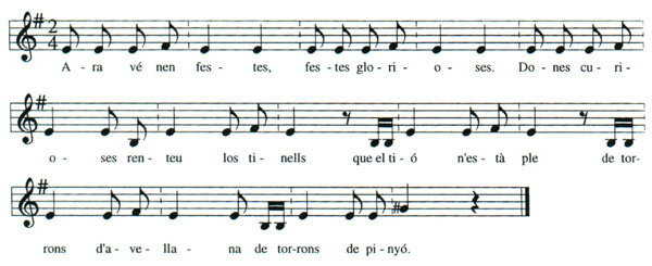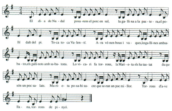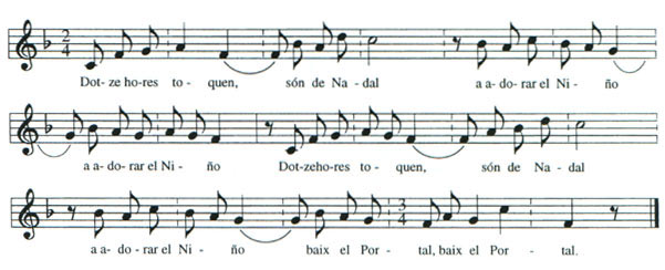 Dins el repertori tradicional de Nadal en trobem moltes, de formuletes amb aquesta funcionalitat. Podem trobar altres versions amb el text lleugerament diferent, més llarg, versions quasi només recitades, etc. Aquí se'ns presenta amb una estrofa de 7 versos més una frase final recitada que formen tot el període musical. |