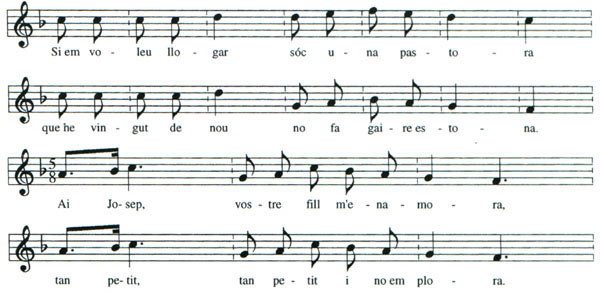 Aquesta melodia és una nadala o villancet formada per quatre estrofes. Evidentment, la lletra d'aquesta cançó podrà variar en els diferents llocs on es canti. En la versió que ens ha donat la nostra informant, hi trobem un element etnogràfic característic: un barbarisme, niño, que no és estrany al vocabulari nadalenc de la zona. ![]() |