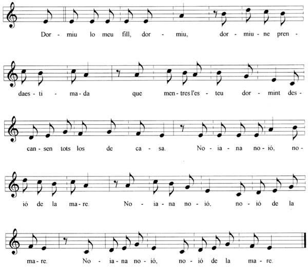 Dormiu, lo meu fill, dormiu, dormiu-ne, prenda estimada, que mentres l'esteu dormint descansen tots los de casa. Noiana, noió,
