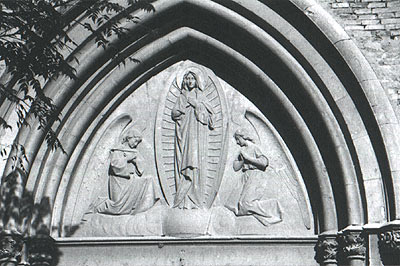L'any 1838 apareix un pagament "para la cera que se consume en las fiestas y músicos de los Stos. Patrones", mentre que l'any 1853, l'organista de la parròquia, en Joan Ardèvol, rebia 589 rals com a "encargado de las fiestas celebradas á los Stos. Patrones". També, l'any 1863 apareixen 72,74 rals "para el refresco de la Fiesta Mayor". Encara més, l'any 1852 es gasten sis rals en un ruc per portar un predicador i 120 rals per al ball de valencians de Tomàs Nolla i Anton Bartra. Era habitual que el municipi nomenés una persona perquè es fes càrrec de les despeses i de l'organització de la festa; per exemple, sabem que l'any 1836 se n'encarregava en Francesc Juste, i el 1853 en Joan Ardèvol6. Imatge en honor a la Mare de Déu al timpà de la portalada d'entrada de la parròquia de Santa Maria de Cambrils |