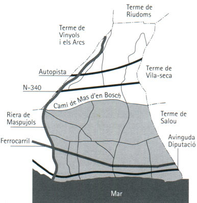 Entre les viles de Cambrils i Vila-seca s'estén un territori antigament parcel·lat en nombrosos termes i quadres3. Avui en dia és dificil establir amb exactitud els límits de cada una d'aquestes divisions, de les quals Vilafortuny n'era un més. De la parròquia de Santa Maria de Vilafortuny en depenien, a començaments de segle XIX, els termes de Barenys, Vilagrassa, Mas d'en Bisbe, Mas de l'Abat, les Comes d'Ulldemolins i les Franqueses, a part de Vilafortuny.4 L'actual desenvolupament urbanístic ha generalitzat el nom de Vilafortuny, tot englobant les partides de Vilafortuny, Cap de Sant Pere, Tallats, Mas d'en Bosch i Mas de Clariana. El Mas d'en Bisbe i Vilagrassa encara resten sense urbanitzar, mentre que la resta de termes que hem anomenat pertayen ara a Salou i Vila-seca. |